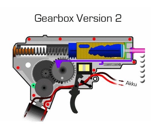 Simpel gezegd, een AEG wordt aangedreven door een ingebouwde batterij die vergelijkbaar is met die gebruikt in R / C-auto’s, helikopters enz. De batterij stuurt stroom naar een motor (normaal gesproken in de pᎥstol Grip van de AEG) die 3 versnellingen in de replica draait, om een zuiger in de versnellingsbak te comprimeren en los te laten om een explosie van lucht te creëren om een BB door de loop te stuwen.