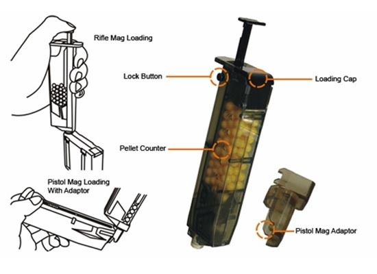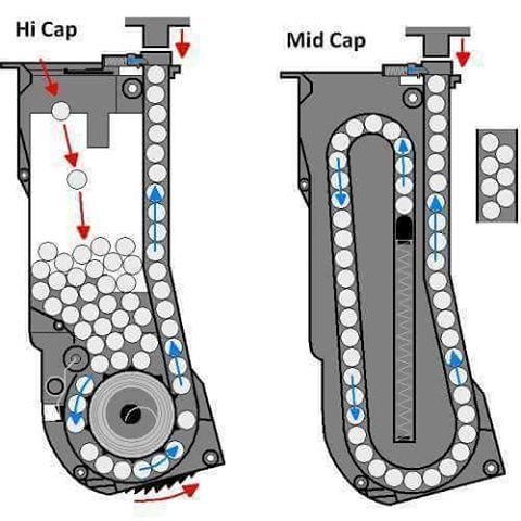 Mid- en Low Caps worden opnieuw geladen met behulp van een externe speedloader omdat deze niet afhankelijk is van een intern wikkelmechanisme. Deze tijdschriften bieden een veel eenvoudiger mechanisme dat gewoon een langwerpige buis in de mag is met een veer; terwijl je de mag vult, comprimeert de veer en zodra de buis vol is, kun je geen BB’s meer naar binnen duwen. Tijdens het vuur worden de BB’s eenvoudig in de kamer geduwd met de genoemde veer.