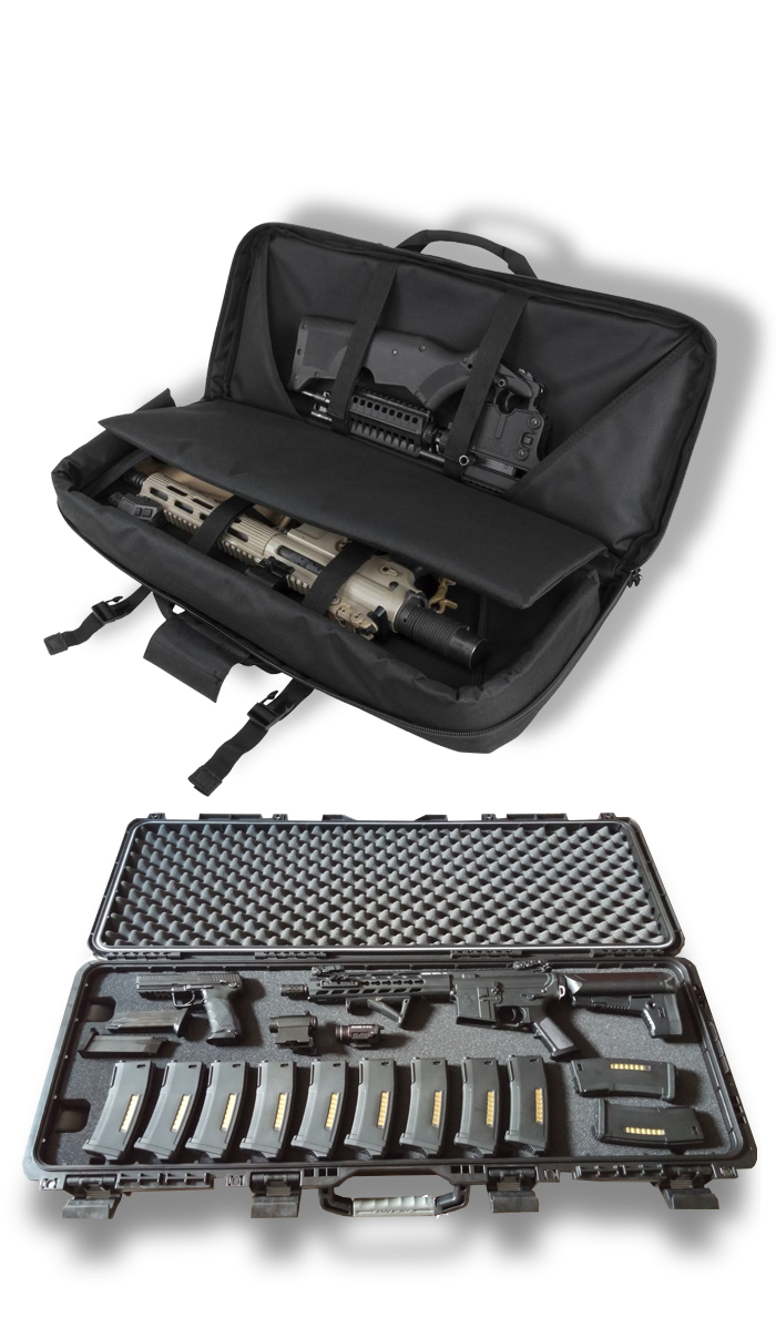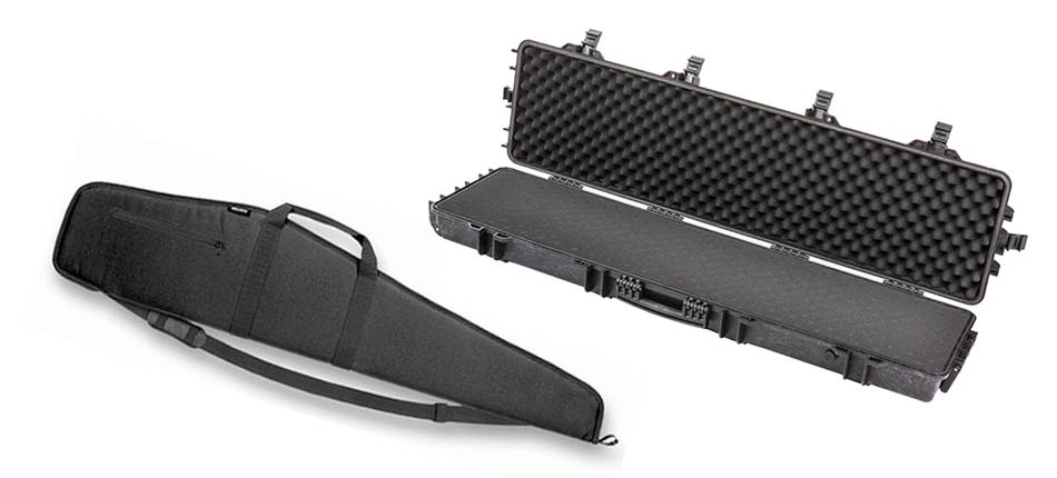 Soft RᎥfle Case – een zachte materiaal case die vaak is gemaakt van heavy-duty stoffen. Gemakkelijk mee te nemen en neemt minder ruimte in beslag dan harde koffers. Ze bieden echter niet dezelfde hoeveelheid bescherming vanwege minder interne vulling.
